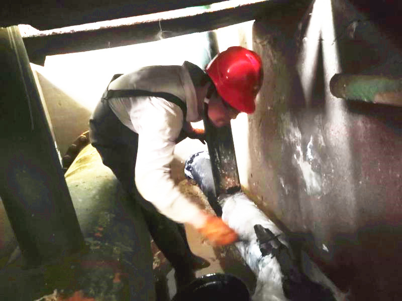 原鹵管線是采鹵崗位重要的組成部分,是停車必檢項(xiàng)之一。但是檢修難度不小,一是過(guò)道空間狹小,光線昏暗,一次僅夠兩個(gè)人同時(shí)作業(yè);二是檢修原鹵管線時(shí),必須“涉水”作業(yè)。檢修期間原鹵管線一閃一閃的焊光將周圍照亮,順著火花向里看去,只見(jiàn)有兩個(gè)人在狹小的空間綣著身子低頭忙活著,感覺(jué)身子都轉(zhuǎn)不開的樣子。他們像小貓似的蜷縮在兩邊,全身濕透,白色的工服也被銹漬染的亂起八糟,被油漬沁透成一坨一坨的,但他們堅(jiān)定的眼神、專注的神情卻叫人佩服。我不禁問(wèn)道:“這么窄的空間人咋進(jìn)去啊?”他們開玩笑的說(shuō):“用縮骨功啊!”