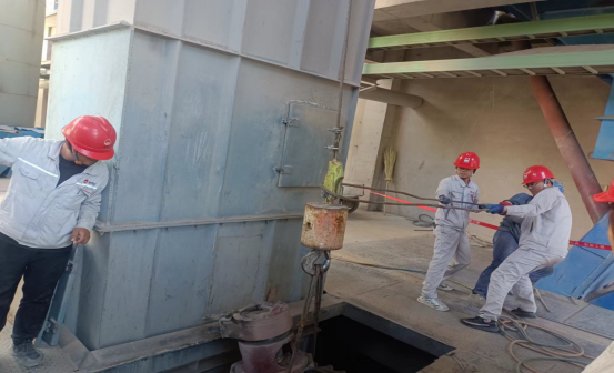更換生料1909提升機鏈條和料斗現(xiàn)場:他們無懼“烤”驗 ,“汗”衛(wèi)設(shè)備有效運行。檢修中,他們手持焊槍,用一片赤忱,“汗”衛(wèi)設(shè)備長周期穩(wěn)定運行,在太陽曝曬下,設(shè)備溫度已達40℃左右,有限高溫作業(yè),一會兒焊接,一會兒切割,一會兒又是安裝……他們堅守一道道安全之門,即使皮膚曬得黝黑,汗水濕透衣衫,依然為的是安全生產(chǎn)穩(wěn)定保駕護航!