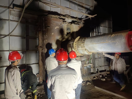 在長期負(fù)壓物料的沖擊下,2022年8月16日正午12:50分,烘干破旋風(fēng)筒管道受力破損變形,導(dǎo)致回轉(zhuǎn)窯系統(tǒng)止料,在線監(jiān)測打維護(hù),實施管道焊補(bǔ)搶修。