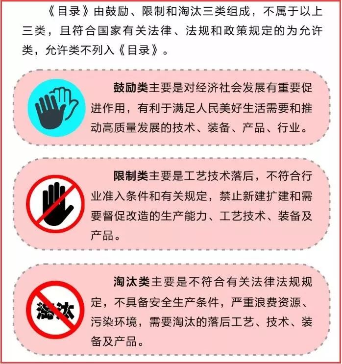 目錄(2019年本)共涉及行業(yè)48個(gè),條目1477條,其中鼓勵(lì)類(lèi)821條、限制類(lèi)215條、淘汰類(lèi)441條。不屬于以上三類(lèi),且符合國(guó)家有關(guān)法律、法規(guī)和政策規(guī)定的為允許類(lèi),不列入《目錄》。