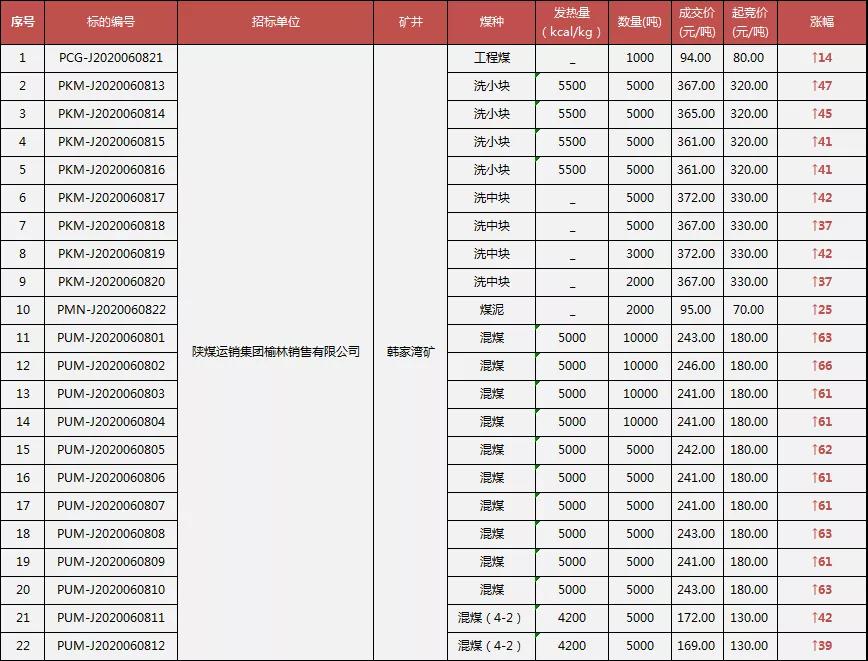 昨日,榆林地區(qū)陜煤旗下六大煤礦最新競價結果公布,成交價最高漲幅達到32元/噸。