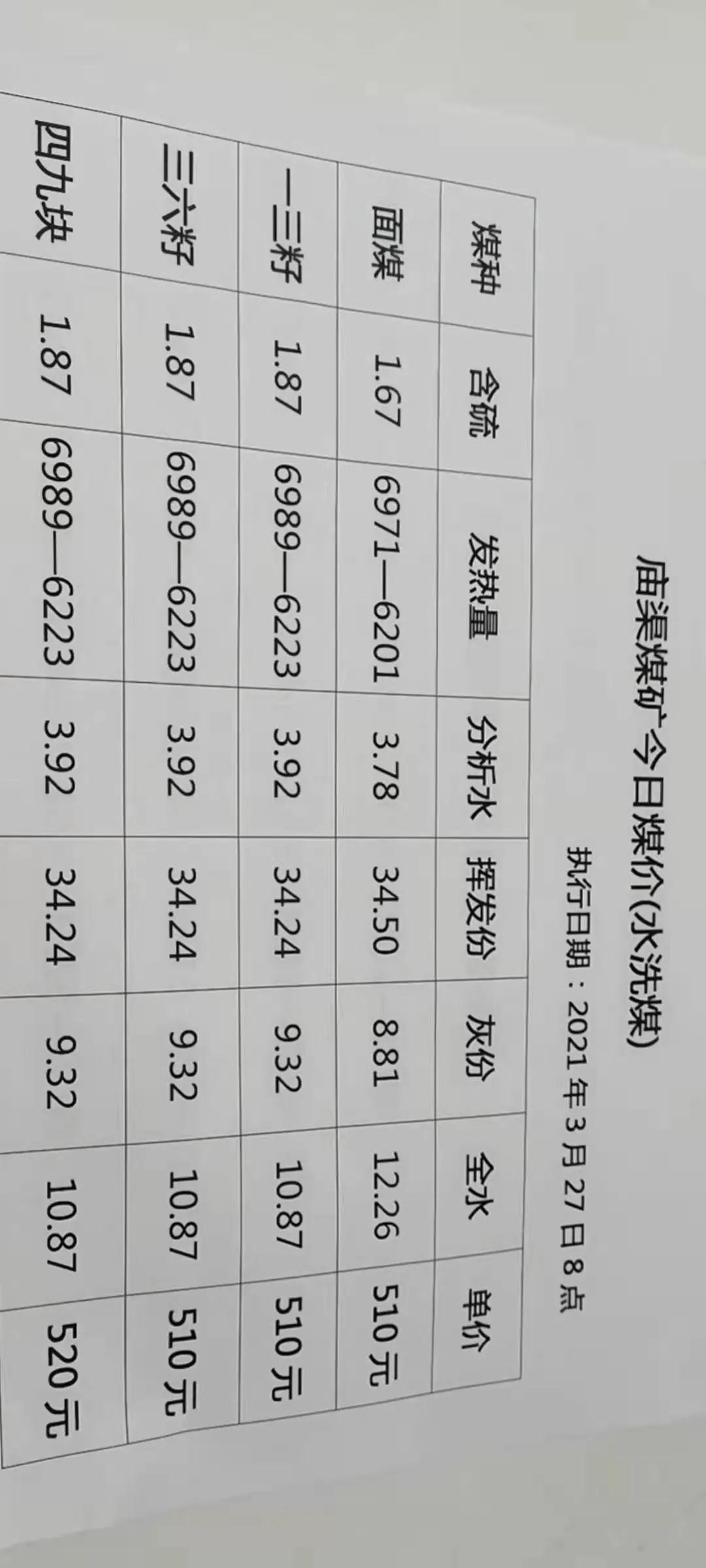 2021年3月28日早7點(diǎn)大砭窯煤礦:面煤漲80元,所有塊煤漲價40元。