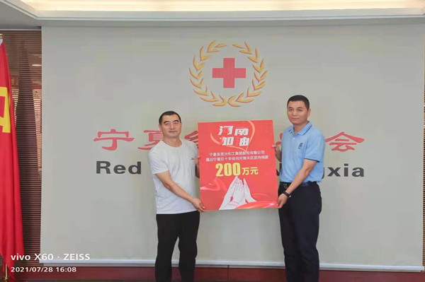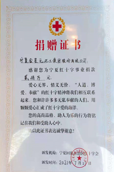 洪災(zāi)無情,人間有愛。7月28日,寧夏金昱元化工集團(tuán)股份有限公司委托寧夏紅十字會向河南災(zāi)區(qū)捐助二百萬元,馳援河南受災(zāi)地區(qū),表達(dá)對災(zāi)區(qū)人民的深切問候。